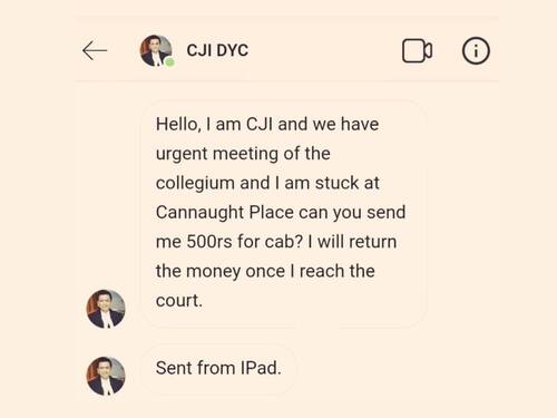 स्क्रीनशॉट में लिखा था, हैलो, मैं CJI हूं और हमारे पास कॉलेजियम की एक जरूरी बैठक है और मैं कनॉट प्लेस में फंस गया हूं, क्या आप मुझे कैब के लिए 500 रुपये भेज सकते हैं. जालसाज ने आगे लिखा कि मैं कोर्ट पहुंचते ही पैसे लौटा दूंगा. ठग ने संदेश के अंत में Sent From IPad लिखा है.